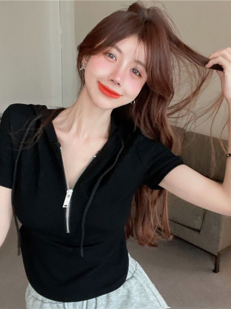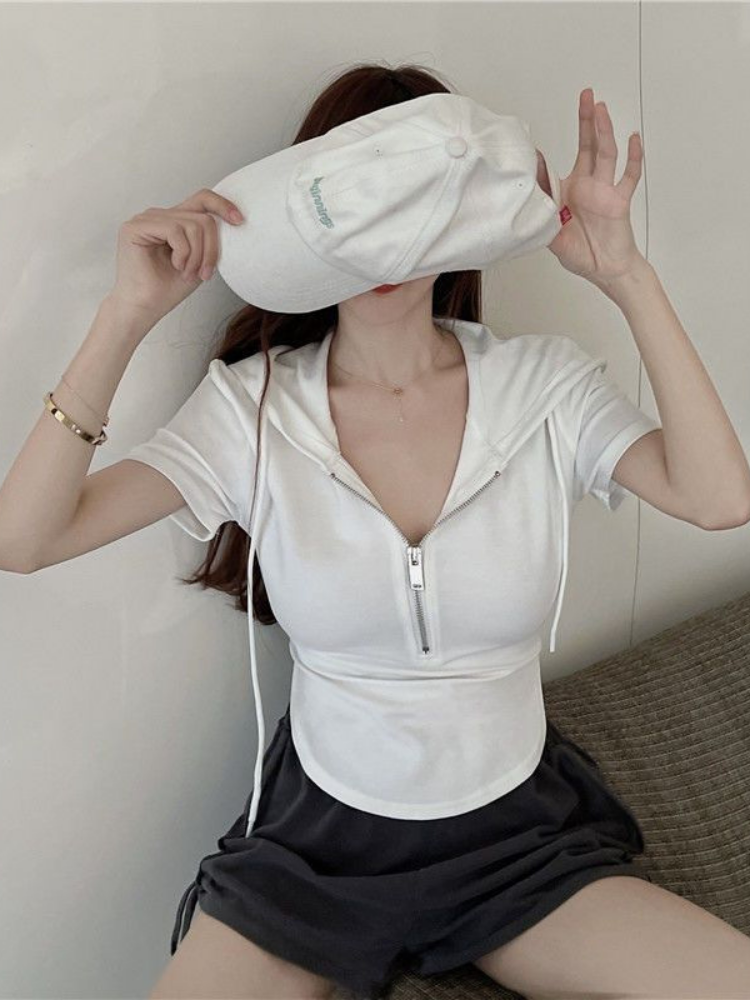 This solid color hooded short top is made of comfortable fabric, ensuring a comfortable wearing experience. Its pattern is plain and simple, without any extra fancy elements, presenting a simple and generous style. Additionally, it features a pullover style, and the sleeves can effectively cover the excess flesh on the arms, making the figure more perfect. The neckline is designed with a zipper for easy wearing and removal, making it casual and versatile.